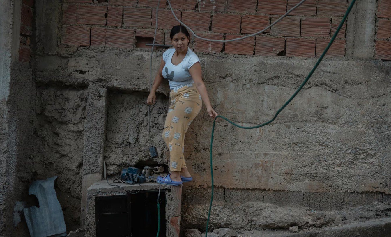 Una mujer recoge la bomba para recolectar agua en Petare, Caracas.