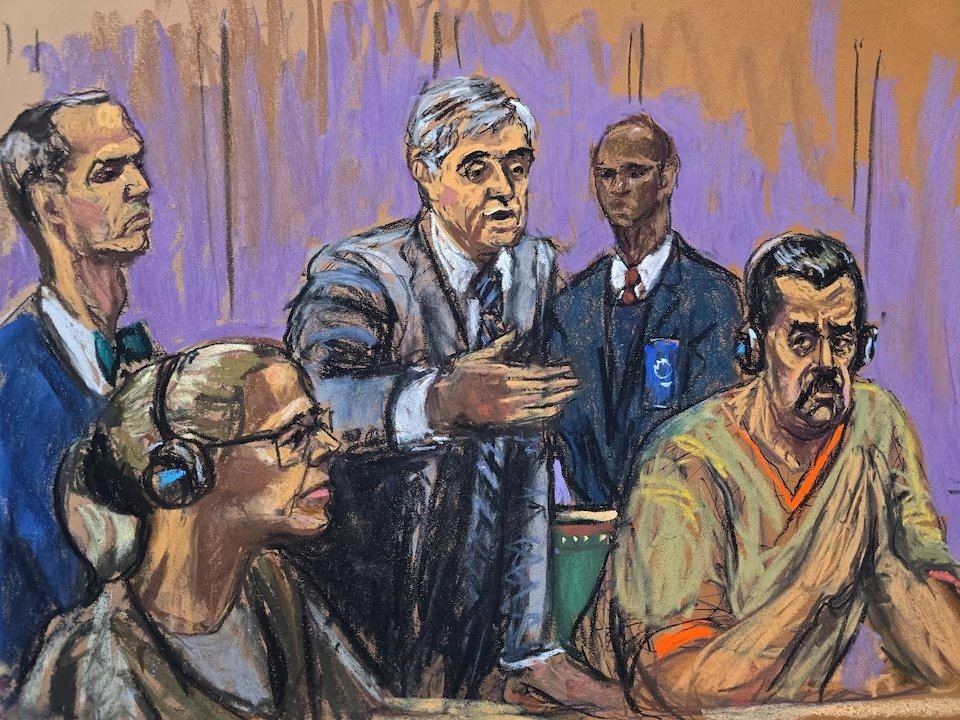 Una segunda ilustración capturó la escena desde un ángulo diferente, mostrando a Flores y a Maduro sentados uno al lado del otro, ambos con auriculares. El abogado Pollack aparece de pie y de perfil hablando, mientras que una bandera de Estados Unidos es visible a la derecha detrás de él.