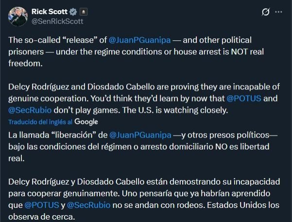 El senador estadounidense Rick Scott le volvió a enviar una advertencia a Delcy Rodríguez y Diosdado Cabello de que su país “observa de cerca” los acontecimientos en Venezuela, en referencia a las irregularidades de las excarcelaciones a los políticos de oposición.