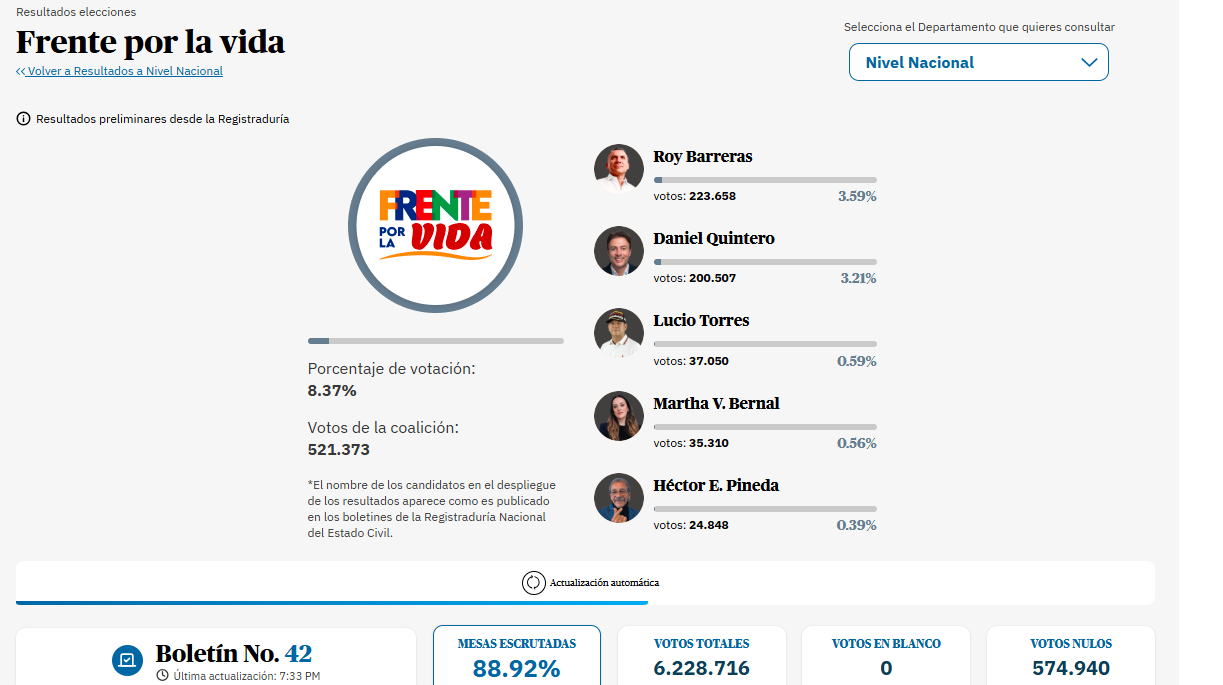 Con el 82,14 % de las mesas informadas, Barreras, del movimiento ‘Solo con Roy ganamos todos’, acumula 203.712 votos, mientras que el exalcalde de Medellín Daniel Quintero llega a 182.605 votos.