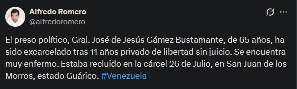 “El preso político, Gral. José de Jesús Gámez Bustamante, de 65 años, ha sido excarcelado tras 11 años privado de libertad sin juicio. Se encuentra muy enfermo”, escribió.