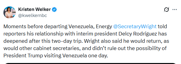 La corresponsal Kristen Welker informó que el representante de la Casa Blanca valoró positivamente el acercamiento logrado con el régimen chavista durante su estadía. De acuerdo con el reporte, Wright describió que el vínculo con Rodríguez se ha «fortalecido» gracias al intercambio directo sostenido en las últimas 48 horas.