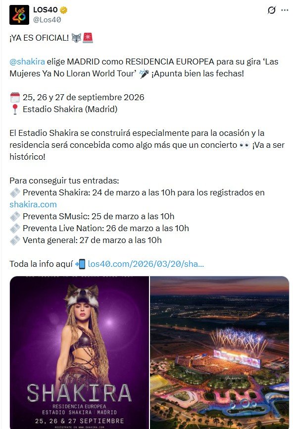 «Concebido como algo más que un concierto», el final de la gira mundial de Shakira llegará en septiembre a España con una «ciudad paralela dentro de Madrid, donde la música, el arte y la comunidad se unirán durante tres noches históricas», los días 25, 26 y 27 de ese mes.