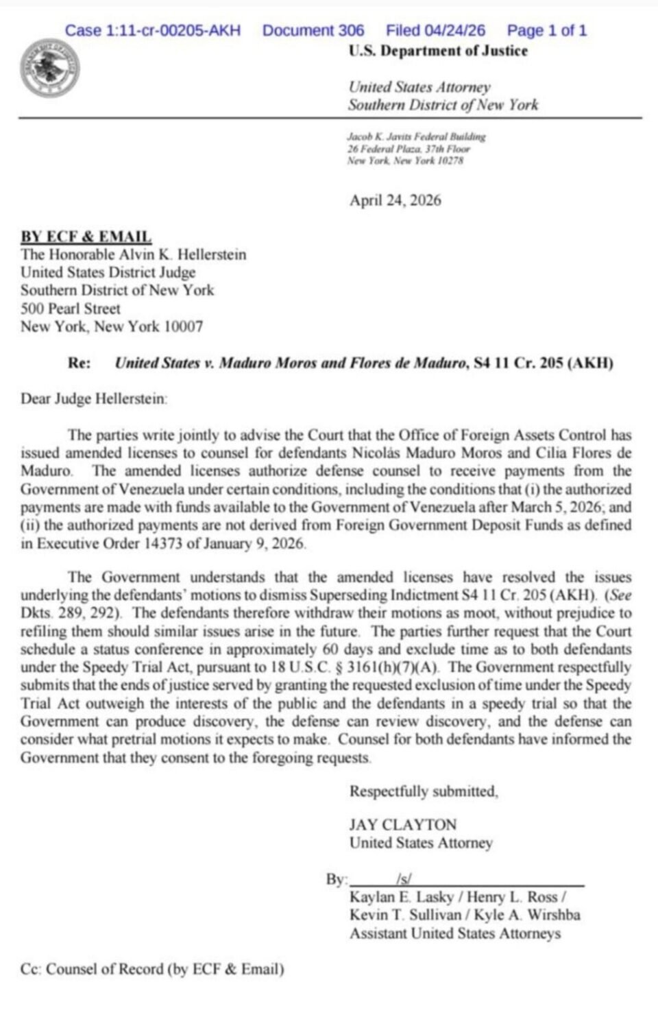 Según una carta conjunta presentada el 24 de abril ante el juez Alvin Hellerstein del Distrito Sur de Nueva York, firmada por el fiscal Jay Clayton, las licencias enmendadas autorizan los pagos bajo dos condiciones: que provengan de fondos disponibles para el gobierno venezolano después del 5 de marzo de 2026, y que no se deriven de fondos de depósito de gobiernos extranjeros definidos en la Orden Ejecutiva 14373 del 9 de enero de 2026.