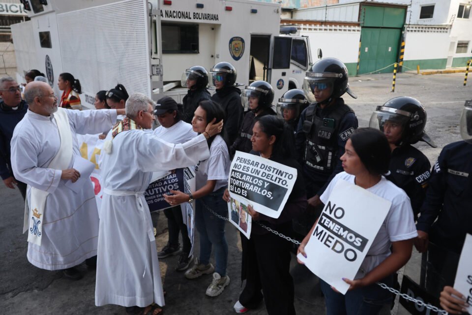 CARACAS (VENEZUELA), 12/02/2026.- Un sacerdote saluda a familiares de presos políticos durante una vigilia frente a la Zona 7 este jueves, en Caracas (Venezuela). EFE/ Miguel Gutiérrez