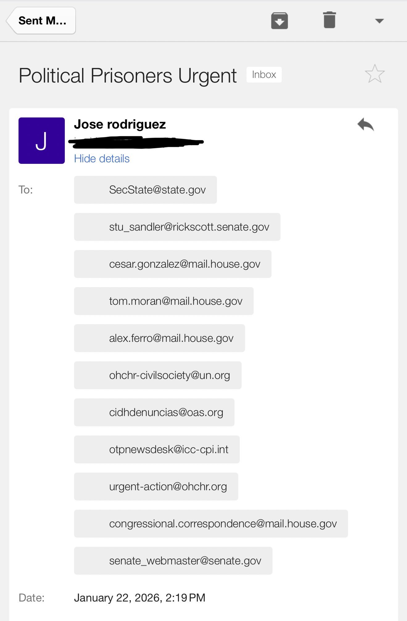 Asimismo, la petición fue remitida directamente al senador Rick Scott y a los congresistas Carlos Giménez, María Elvira Salazar y Mario Díaz-Balart, quienes han mantenido una posición crítica frente a la situación de derechos humanos en Venezuela.