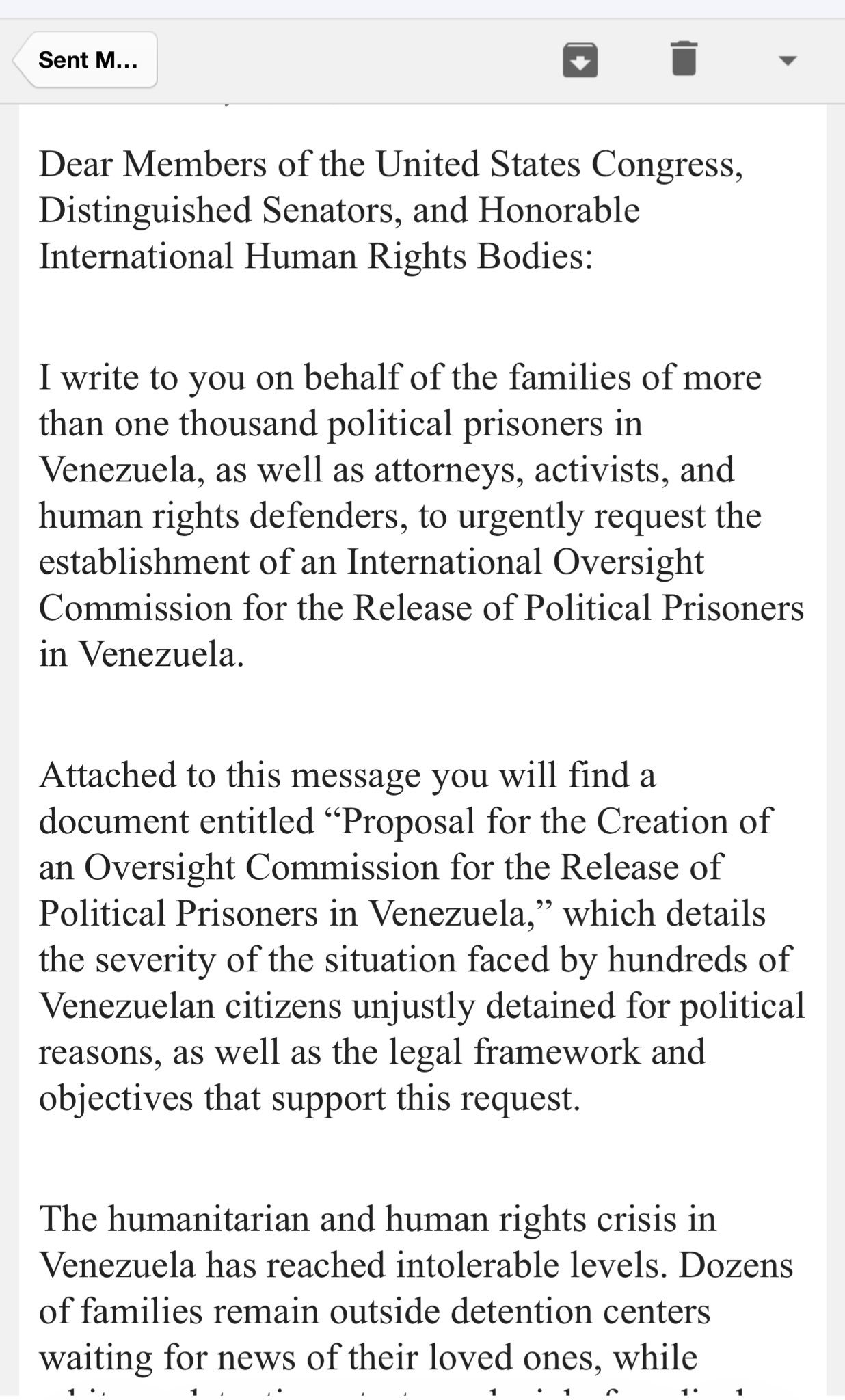 En el mensaje también se informó que fue adjuntado un documento formal con la propuesta de creación de la comisión, así como una primera lista de presos políticos, la cual habría sido verificada por la abogada y defensora de derechos humanos Tamara Suju, directora ejecutiva del Casla Institute y delegada de la World Jurist Association (WJA) ante la CPI.