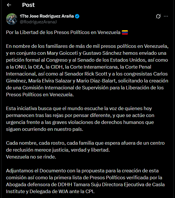 El teniente venezolano en el exilio, José Rodríguez Araña, informó la tarde de este jueves 22 de enero que fue enviada una petición formal al Congreso y al Senado de Estados Unidos, así como a diversos organismos internacionales, para solicitar la creación de una Comisión Internacional de Supervisión para la Liberación de los Presos Políticos en Venezuela.