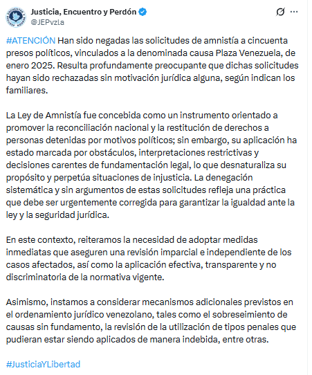 La ONG Justicia, Encuentro y Perdón denunció que fueron negadas las solicitudes de amnistía para 50 presos políticos vinculados a la denominada «causa Plaza Venezuela» de agosto de 2025.