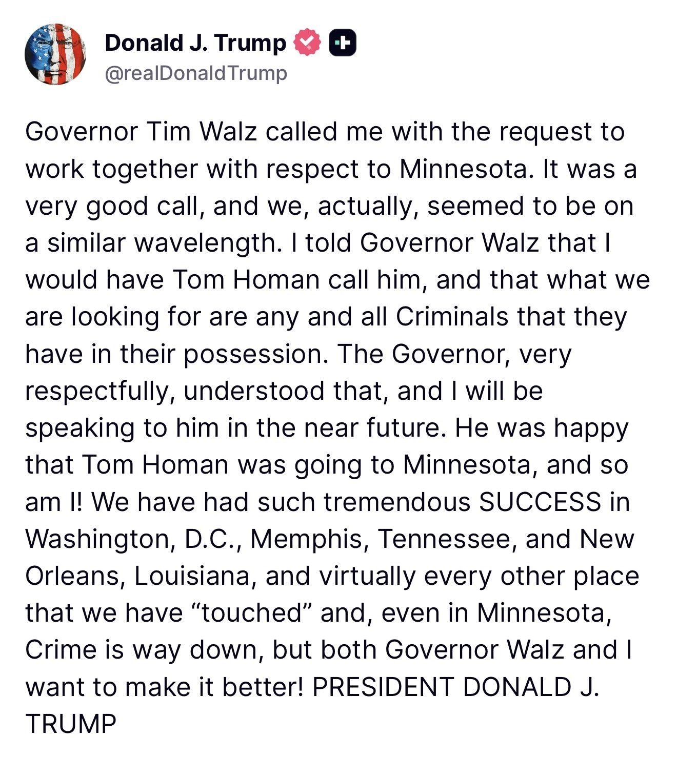 «Estaba feliz de que Tom Homan fuera a Minnesota, ¡y yo también!», escribió Trump en una publicación en redes sociales que se destacó por su tono cálido y colaborador hacia el gobernador de Minnesota, a quien Trump suele ridiculizar.