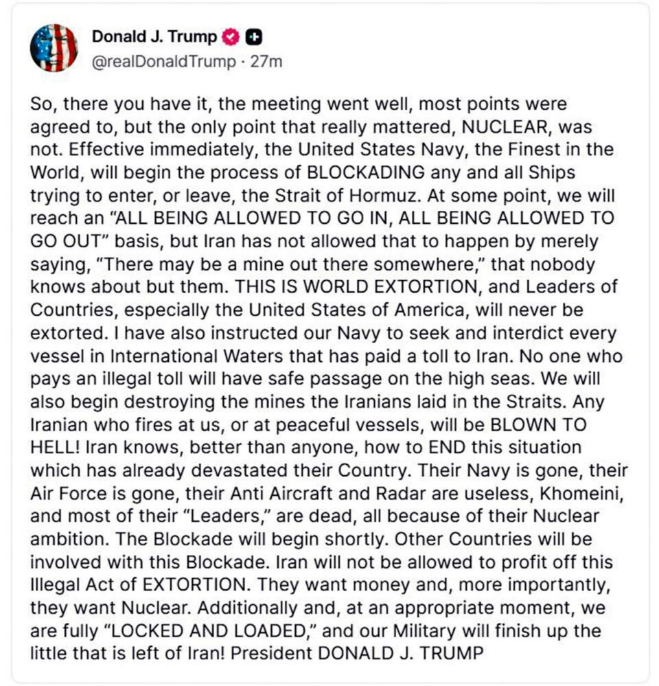 «El bloqueo comenzará en breve. Otros países participarán en este bloqueo. No se permitirá que Irán se beneficie de este acto ilegal de extorsión. Quieren dinero y, más importante aún, quieren armas nucleares», dijo.