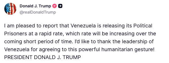 En su mensaje, Trump se mostró complacido de informar sobre estos avances, sugiriendo un conocimiento directo de las gestiones en curso. «Me complace informar que Venezuela está liberando a sus presos políticos a un ritmo rápido», señaló el jefe de Estado norteamericano.