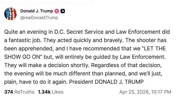 A través de un breve mensaje, el mandatario norteamericano ofreció un balance sobre el incidente armado que obligó a su repentina evacuación. «Una noche memorable en Washington D.C. El Servicio Secreto y las fuerzas del orden hicieron un trabajo fantástico. Actuaron con rapidez y valentía», expresó Trump para reconocer el despliegue táctico de sus escoltas.
