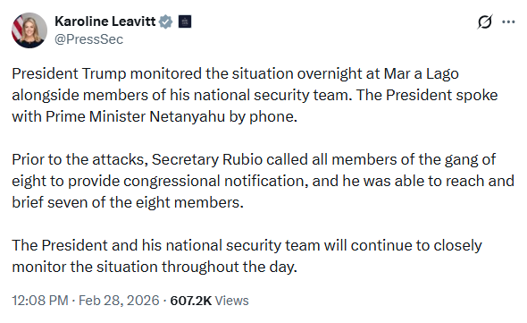 «El presidente y su equipo de seguridad nacional continuarán monitoreando de cerca la situación durante todo el día», declaró Leavitt.