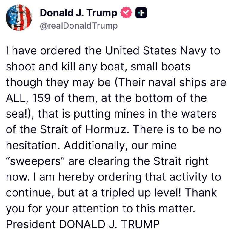 «He ordenado a la Armada de Estados Unidos disparar y hundir cualquier embarcación que esté colocando minas en las aguas del estrecho de Ormuz, por pequeñas que sean (¡sus buques de guerra, los 159, están TODOS en el fondo del mar!). No debe haber ninguna vacilación», anunció Trump en su red Truth Social.