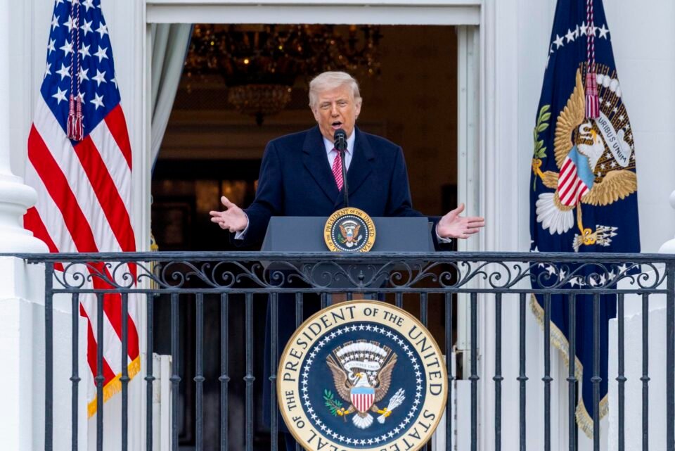 El presidente estadounidense, Donald J. Trump, dirige unas palabras a agricultores y ganaderos durante un evento en el Jardín Sur de la Casa Blanca, en Washington, D.C. (EE. UU.), el 27 de marzo de 2026. El presidente Trump anunció nuevas garantías de préstamos gubernamentales y nuevas directrices para la reducción de costos en la regulación de maquinaria agrícola. EFE/EPA/SHAWN THEW / POOL