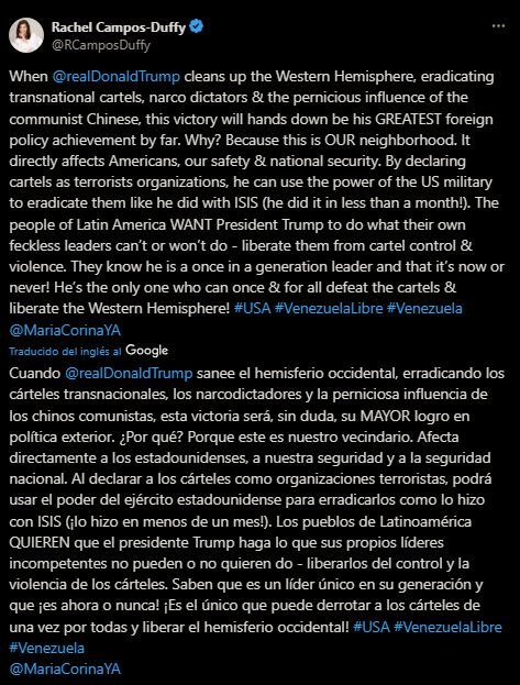 “Los pueblos de Latinoamérica quieren que el presidente Trump haga lo que sus propios líderes incompetentes no pueden o no quieren hacer: liberarlos del control y la violencia de los cárteles. Saben que es un líder único en su generación y que es ahora o nunca. ¡Es el único que puede derrotar a los cárteles de una vez por todas y liberar el hemisferio occidental!”, escribió Campos-Duffy.