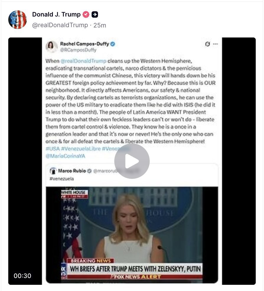 El mensaje compartido por Trump refleja la continuidad de su narrativa sobre seguridad hemisférica y lucha contra el narcotráfico, con especial atención a Venezuela.