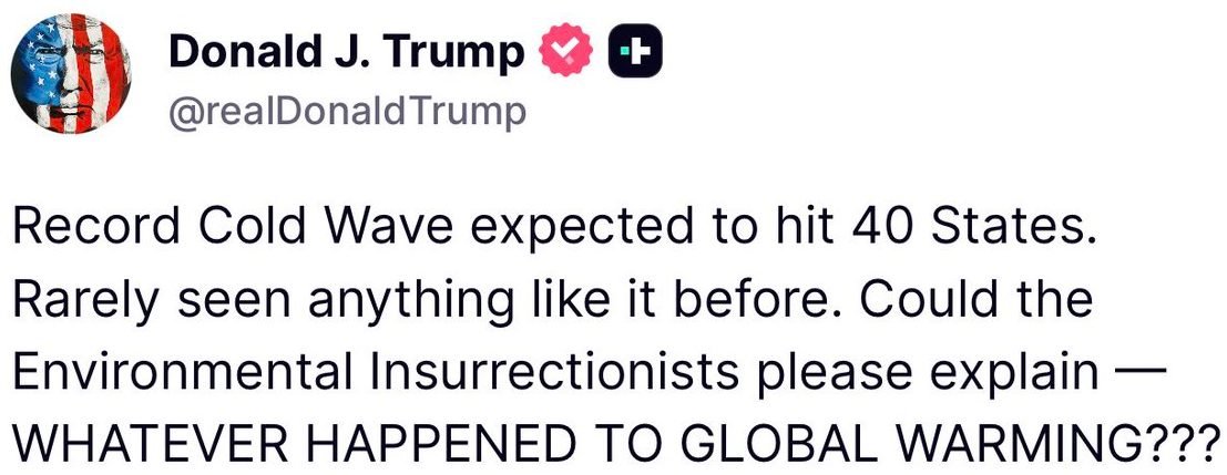 «Se espera que una ola de frío récord afecte a 40 estados. Rara vez se ha visto algo parecido. ¿Podrían los ‘insurrectos ambientales’ explicar QUÉ PASÓ CON EL CALENTAMIENTO GLOBAL?», escribió Trump en su red Truth Social.