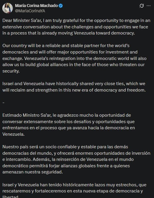 La líder opositora resaltó los lazos históricos entre Israel y Venezuela, y aseguró que en una futura etapa democrática «estos vínculos serán fortalecidos y ampliados, con un enfoque en cooperación, seguridad y desarrollo económico».