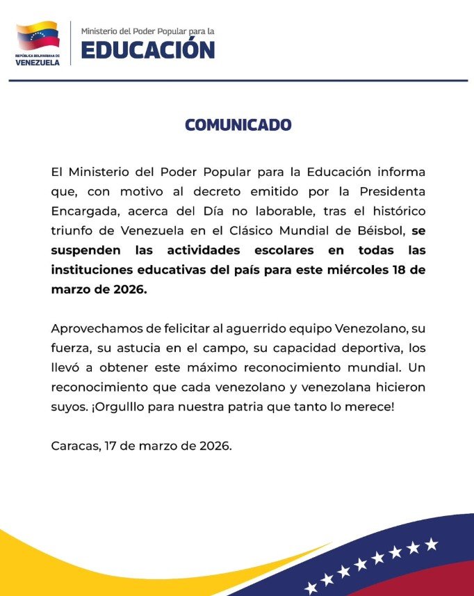 El Ministerio para la Educación anunció la suspensión de las actividades escolares en todo el país para el miércoles 18 de marzo, tras el decreto de día no laborable por el campeonato de Venezuela en el Clásico Mundial de Béisbol.