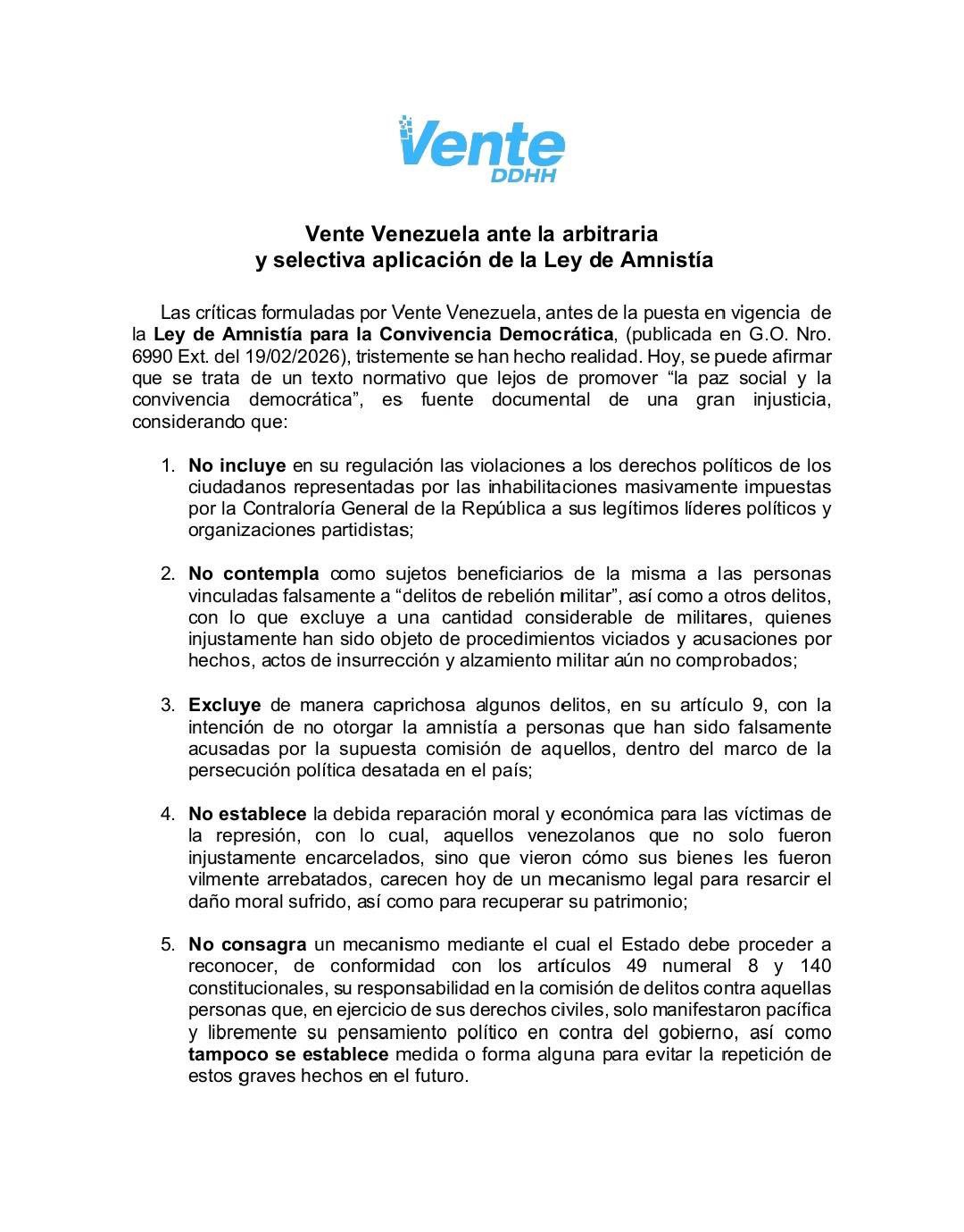 El Comité de Derechos Humanos de Vente Venezuela emitió este miércoles 18 de marzo, un contundente comunicado en el que denuncia la aplicación arbitraria y selectiva de la Ley de Amnistía, publicada en la Gaceta Oficial N° 6990 Ext. el 19 de febrero de 2026.