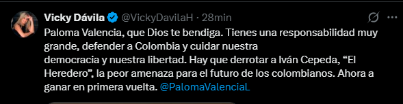 “Paloma Valencia, que Dios te bendiga. Tienes una responsabilidad muy grande, defender a Colombia y cuidar nuestra democracia y nuestra libertad. Hay que derrotar a Iván Cepeda, ‘El Heredero’, la peor amenaza para el futuro de los colombianos. Ahora a ganar en primera vuelta”, escribió.