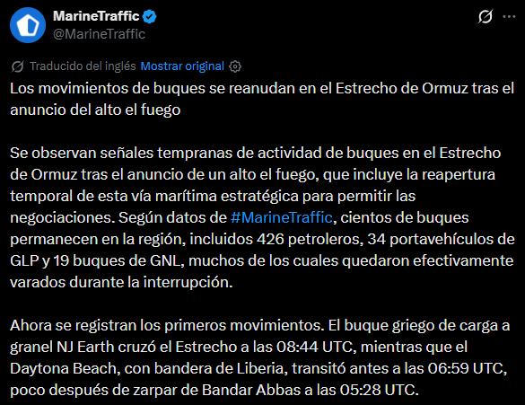 La plataforma indicó que «el entorno operativo parece prácticamente inalterado, con movimientos aún limitados a pasos autorizados bajo estrictas medidas de control, en lugar de una reapertura total impulsada por un alto el fuego», que entró en vigor el miércoles y estaba condicionado a la reanudación del tráfico por el estrecho.