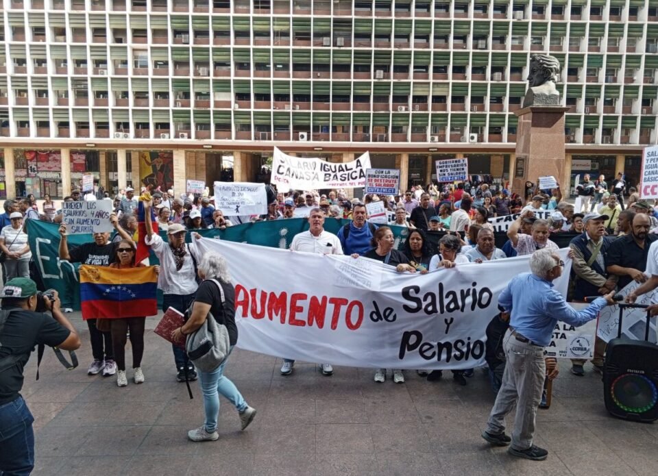 Líderes sindicales y gremialistas se concentraron este jueves frente a la sede del Ministerio del Trabajo en Plaza Caracas para exigir un aumento salarial para todos los venezolanos.