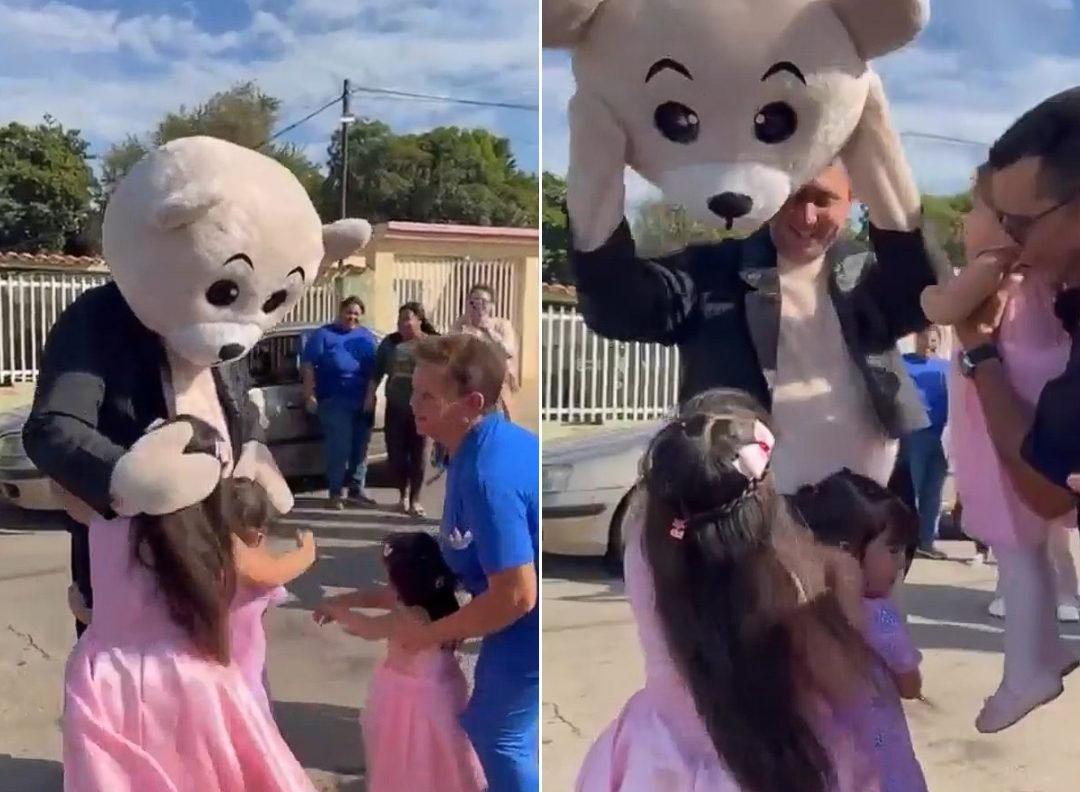 En un video difundido en redes sociales se observó el momento cuando Borjas, disfrazado de oso de peluche, llegó a su vecindario para darles un enorme abrazo a sus hijas luego de revelar su identidad.