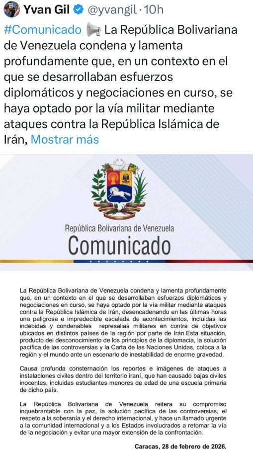 El comunicado chavista, que ni siquiera se atrevía a nombrar a EEUU e Israel, ni a sus gobernantes, aseguraba que «Venezuela condena y lamenta profundamente que, en un contexto en el que se desarrollaban esfuerzos diplomáticos y negociaciones en curso, se haya optado por la vía militar en contra de la República Islámica de Irán».